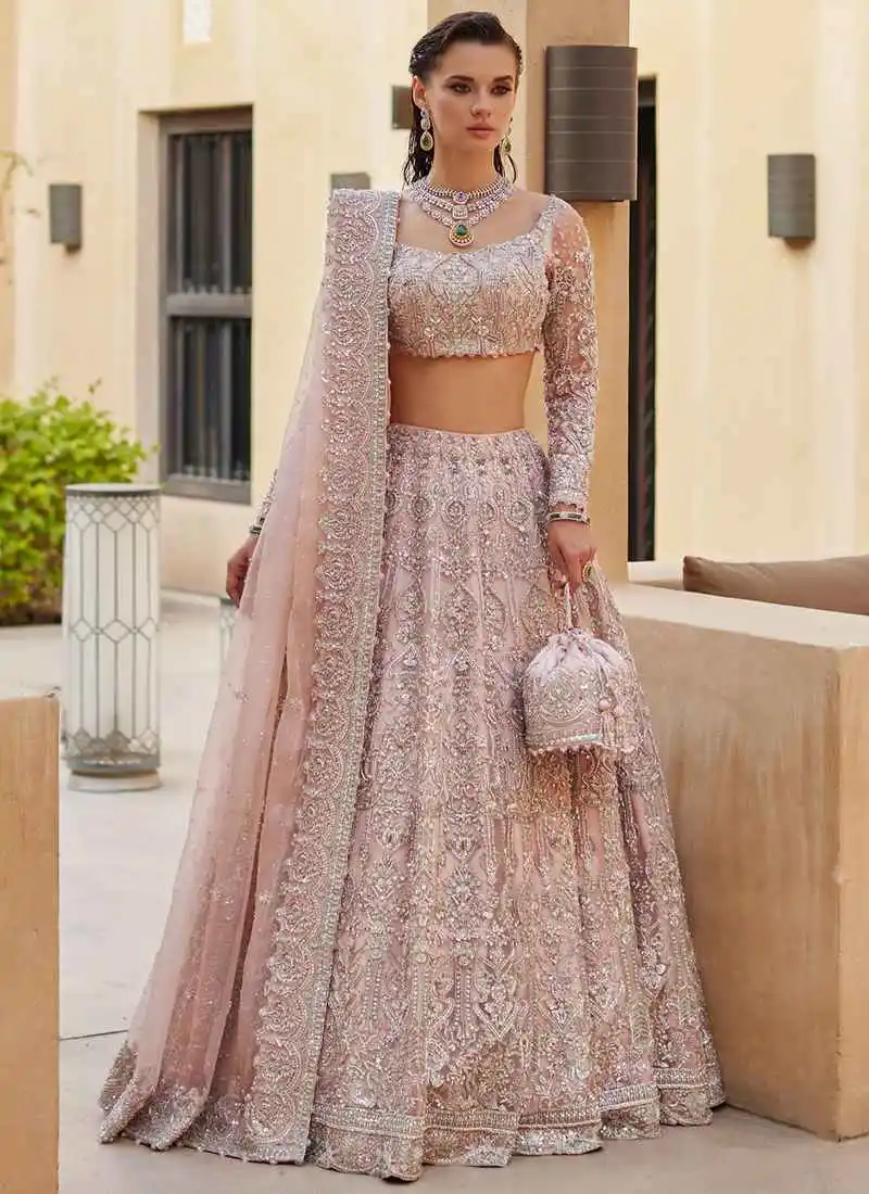For the desi bride, choosing the right lehenga for her big day means everything. Today’s ultra-modern bride loves to wear something out of the box yet breathtakingly elegant. At Shadi Dress, we have incorporated 50+ new bridal lehenga choli designs into our luxury bridal book. Here is one of those super stunning Pakistani bridal clothes – Dusty Pink. It is a traditional flowy lehenga with a modern short blouse. Here are the complete details of this most gorgeous Pakistani wedding dress below:
